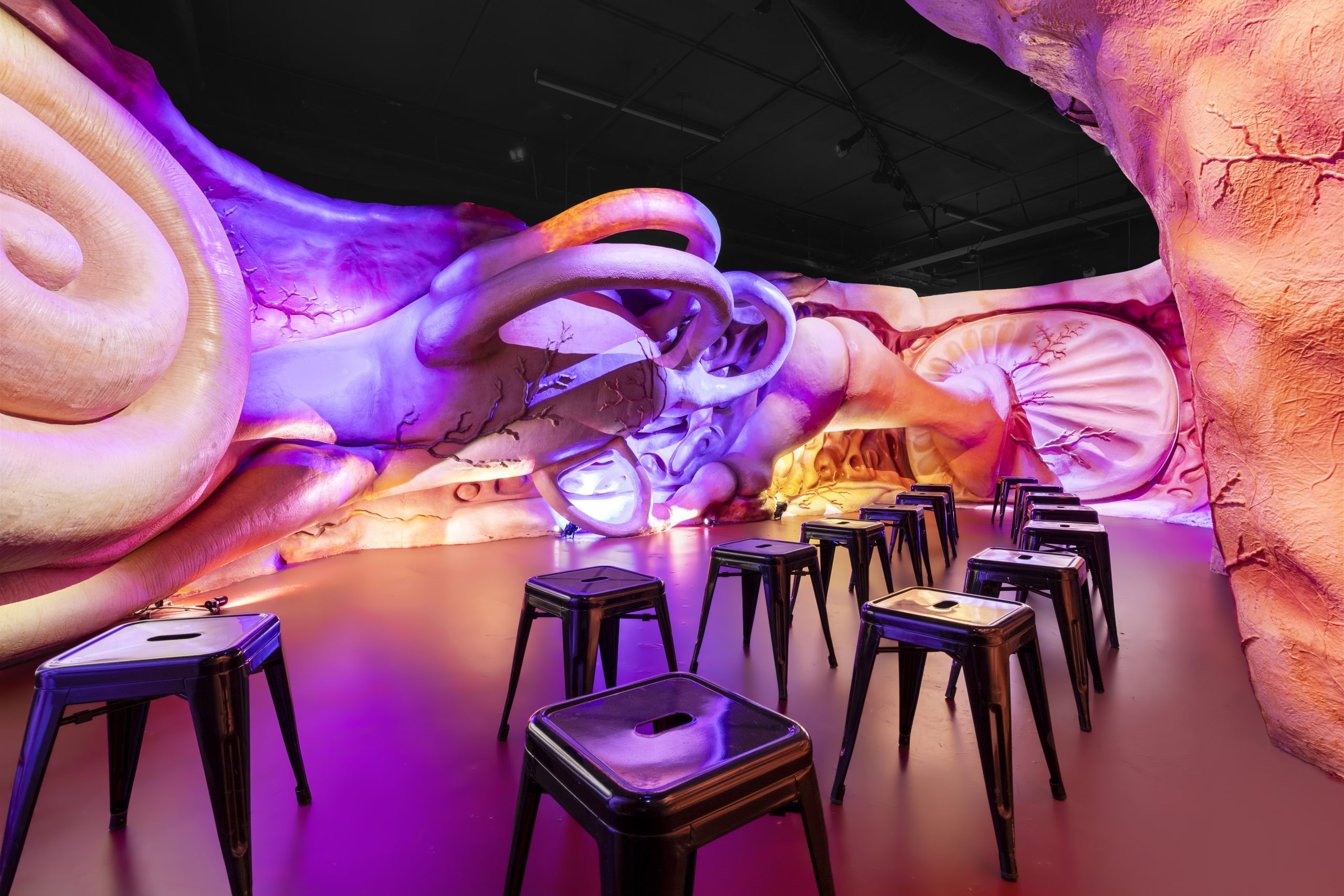In de ‘reis door de mens’ beweeg je je als bezoeker door het menselijk lichaam heen. Je wandelt door de baarmoeder, door de darmen en zo bezoek je verschillende onderdelen van het lichaam. Na de ‘reis’ daal je af via interactieve etages. ‘Huur je het hele pand af, dan kunnen we nu op elke etage een extra ruimte voor subsessies aanbieden’, verduidelijkt Michelle. ‘De interactieve ruimtes zijn groot en functioneel als een zaal, mensen hebben daar lekker de ruimte.’